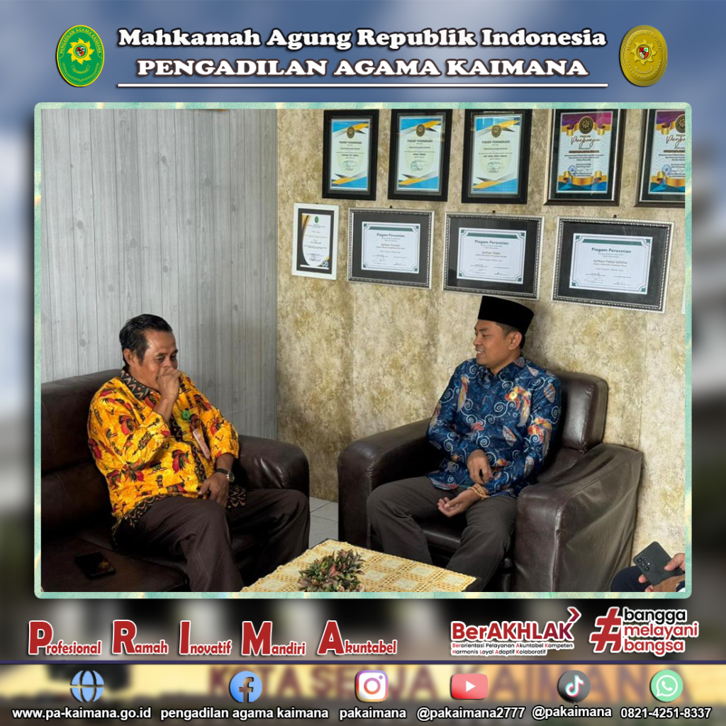 Jum’at, 22 Desember 2023, Ketua Pengadilan Agama Kaimana, Saiin Ngalim, S.H., M.M., menerima kunjungan silaturrahmi Kepala Kantor Kementerian Agama Kabupaten Kaimana, Mustafa Musa Buatan, S.Pd. Kunjungan ini dilakukan sebagai bentuk silaturahmi, sekaligus sebagai kunjungan balasan dengan harapan jalinan kerjasama dan hubungan kekeluargaan antara Pengadilan Agama Kaimana dan Kementerian Agama Kabupaten Kaimana menjadi lebih erat dan […]