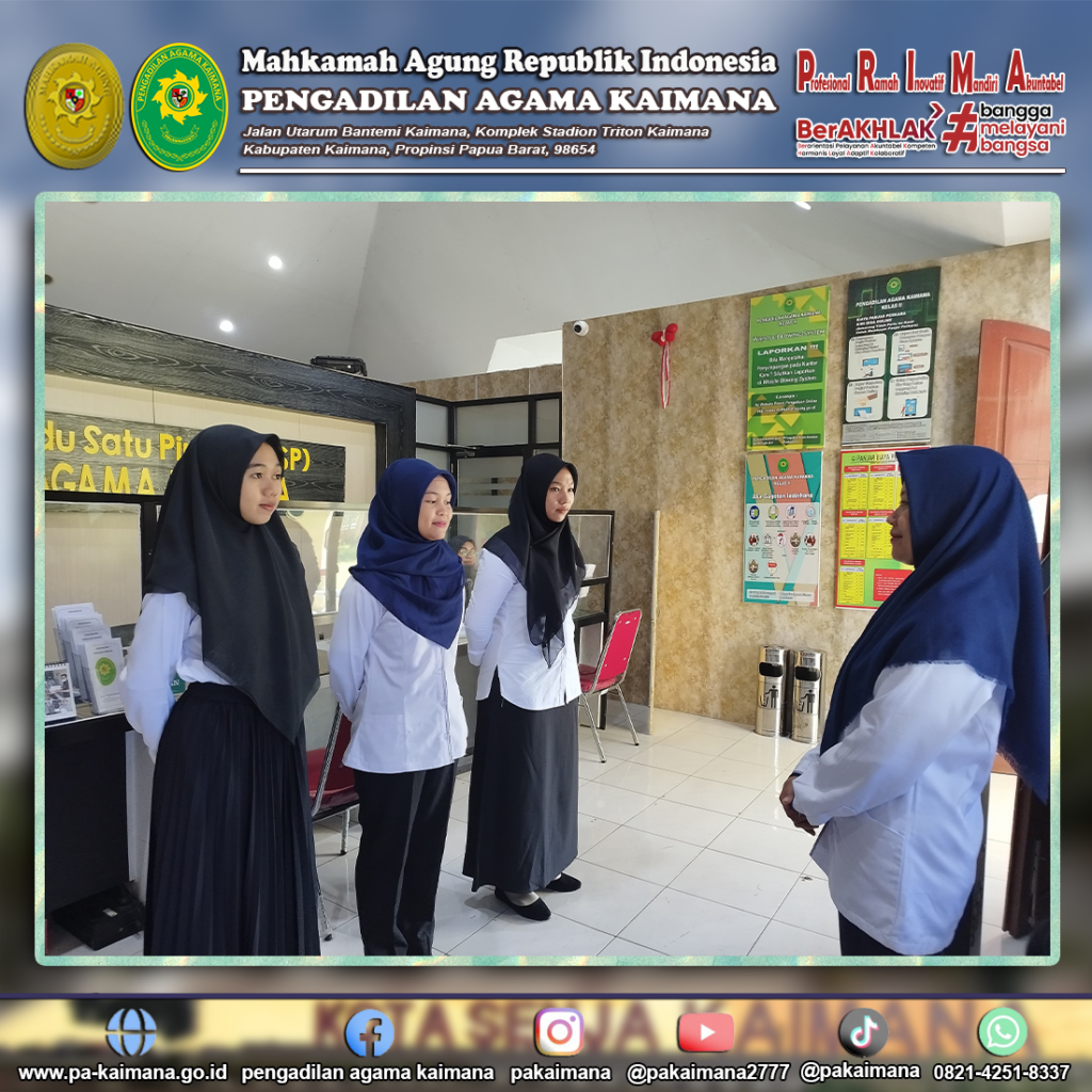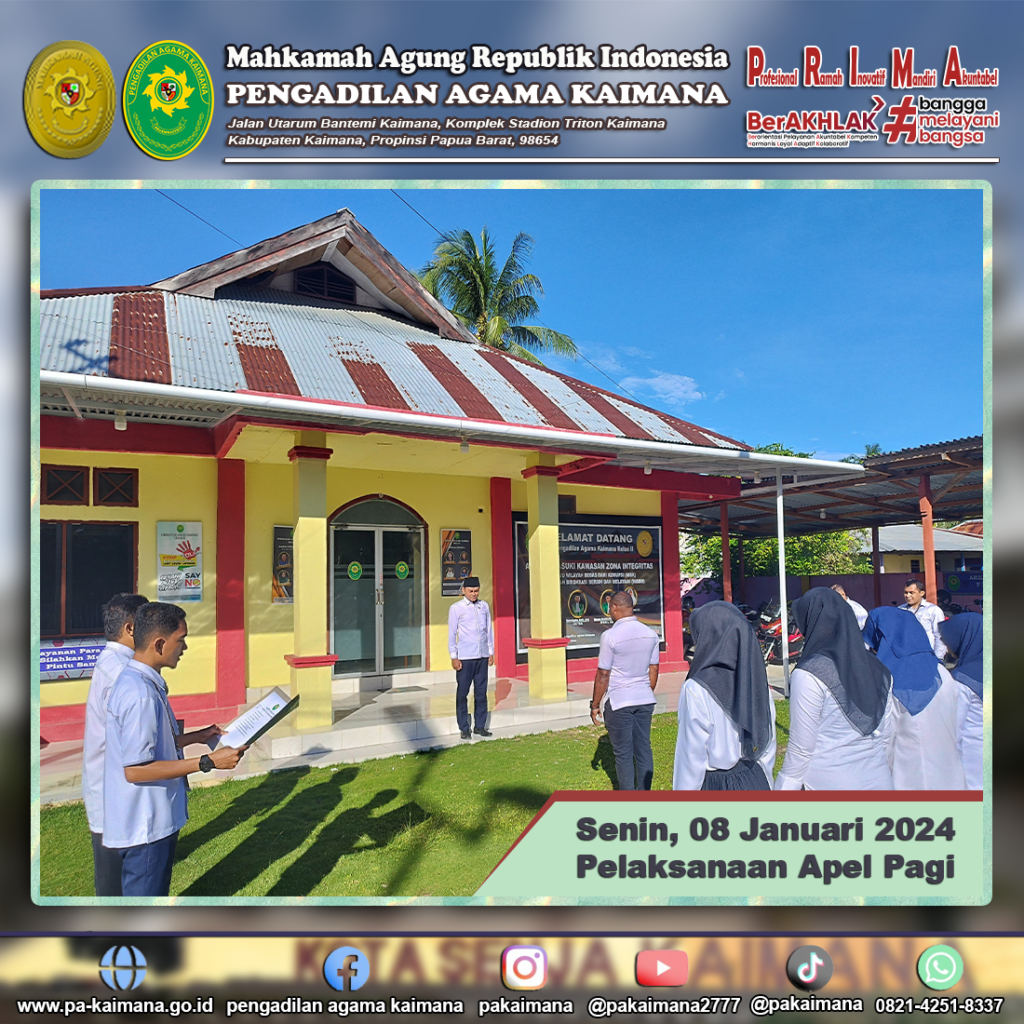 Kaimana, Pengadilan Agama Kaimana menggelar Apel Senin untuk kali pertama pasca libur Natal dan Tahun Baru (NATARU). Berbeda dengan daerah yang lain, Kabupaten Kaimana yang masuk dalam yurisdiksi Provinsi Papua Barat memperoleh libur fakultatif sampai pada tanggal 5 Januari 2024, sehingga segala aktifitas perkantoran dimulai secara efektif pada minggu kedua Januari, yaitu pada Senin, […]