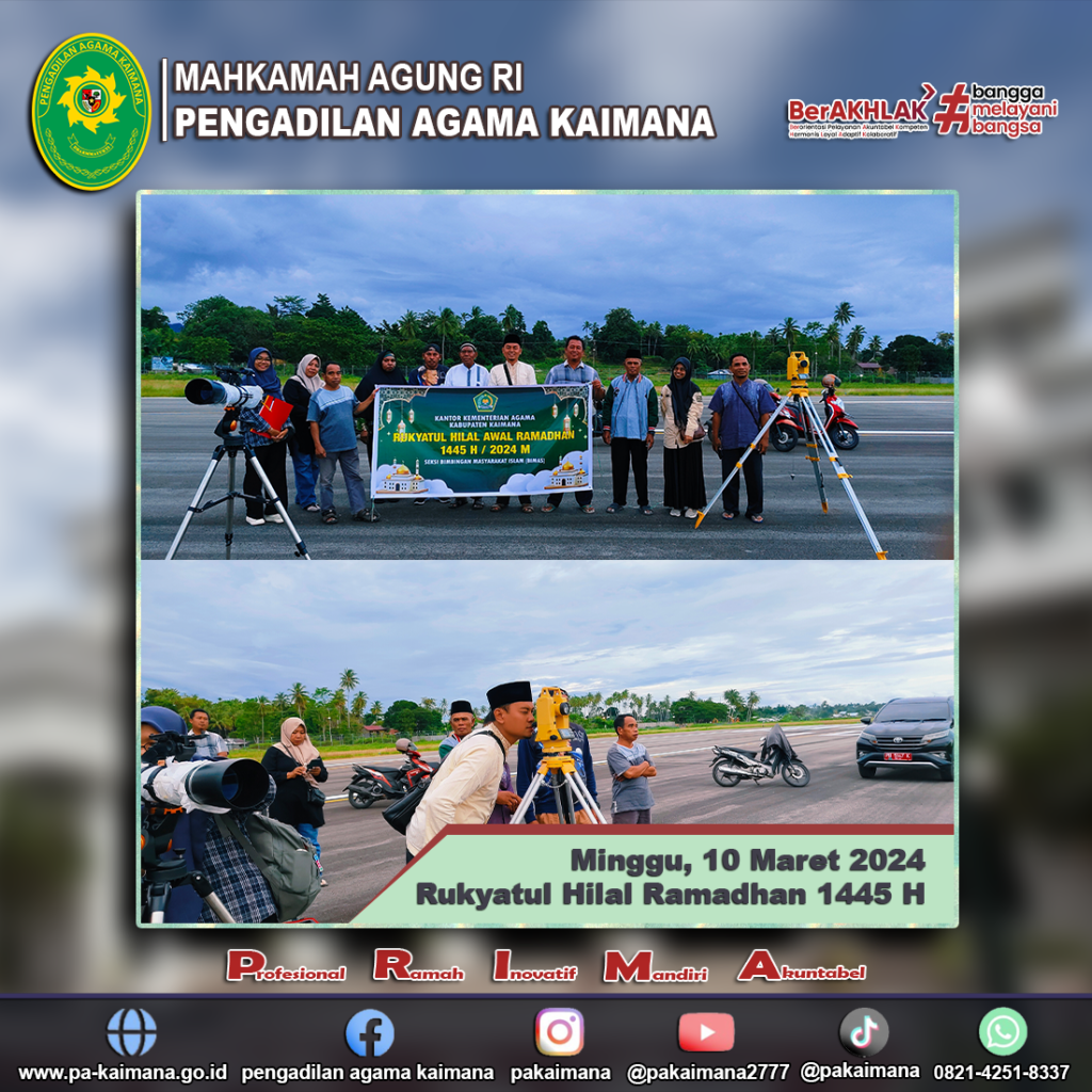 Ketua Pengadilan Agama (KPA) Kaimana, Saiin Ngalim, S.HI., M.M. hadir dalam kegiatan Rukyatul Hilal Ramadhan 1445 Hijriyah, Ahad sore 10 Maret 2024. Kegiatan ini diselenggarakan oleh Kantor Kementerian Agama Kabupaten Kaimana dengan menggandeng Majelis Ulama Indonesia Kabupaten Kaimana. Sebelum acara mengintip bulan baru dimulai, di Kantor Urusan Agama Distrik Kaimana diadakan dialog dengan […]