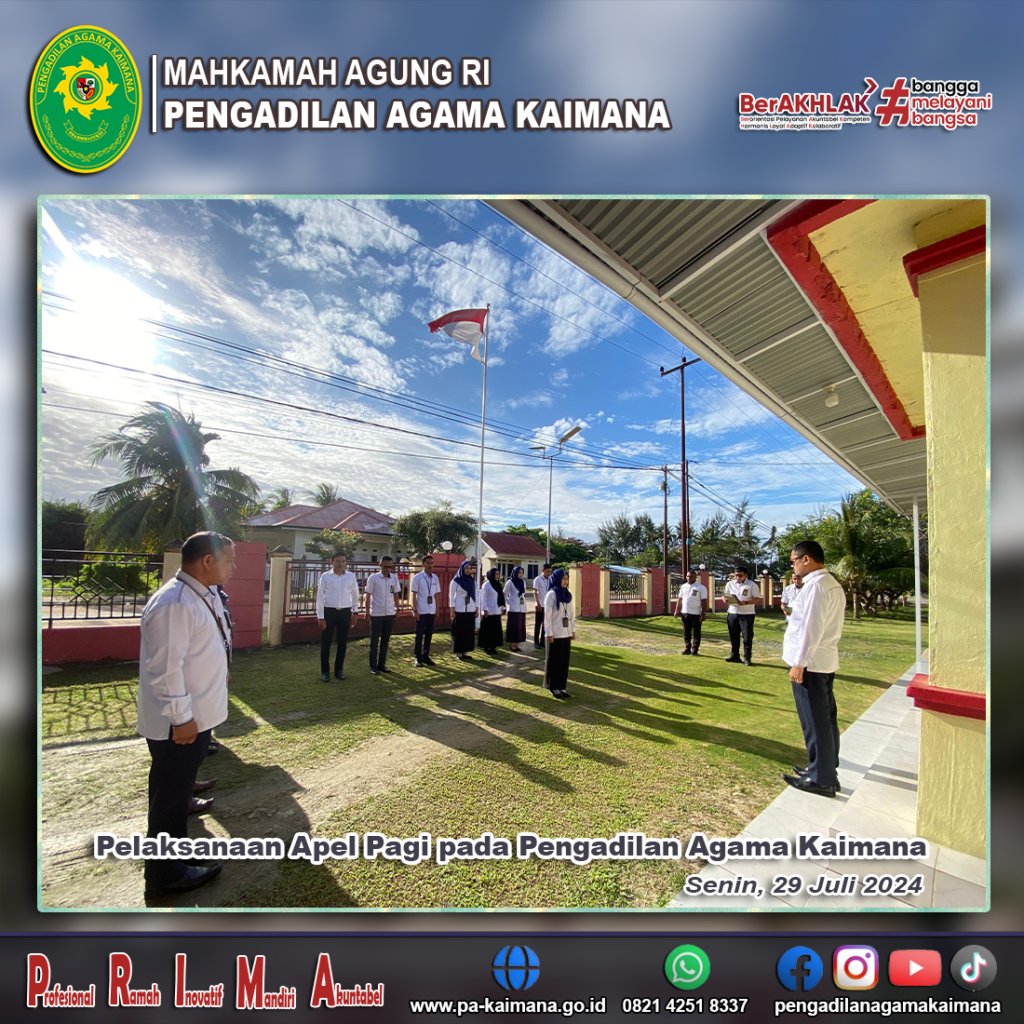 Senin (29/07/2024), Pengadilan Agama Kaimana melaksanakan kegiatan apel pagi seperti biasanya. bertindak selaku Pembina Apel, Ketua PA Kaimana, Saiin Ngalim, S.H.I., M.M. diikuti seluruh pegawai, PPNPN dan Honorer PA Kaimana. Dalam sambutannya selaku pembina apel, Ketua PA Kaimana menyampaikan rasa syukur kehadirat Allah SWT Tuhan semesta alam yang selalu memberikan keberkahan baik berupa kesehatan, […]