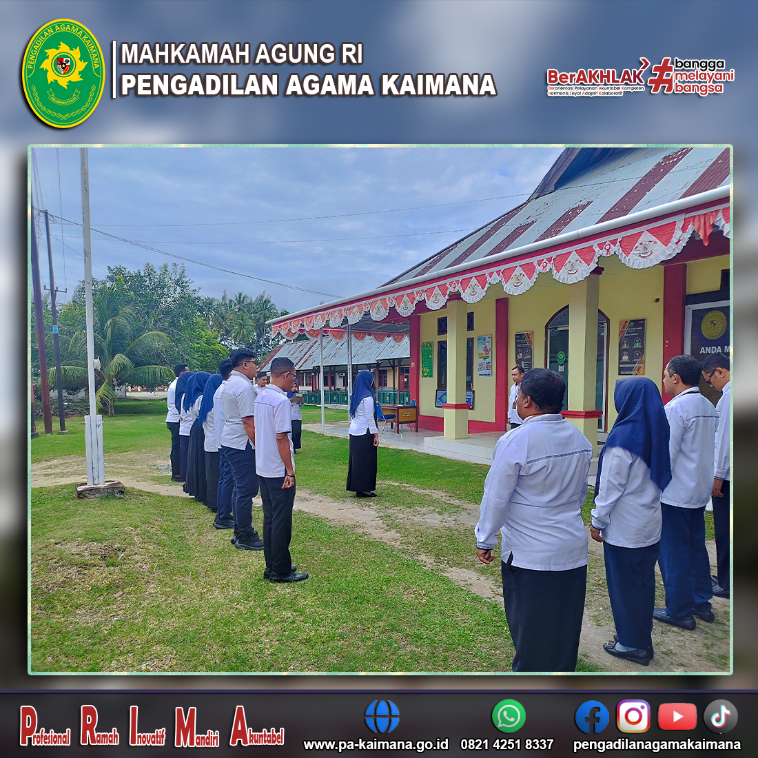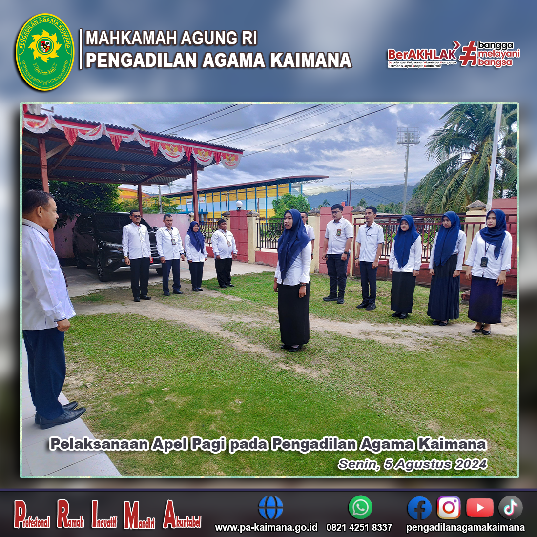 Senin (05/08/2024), Pengadilan Agama Kaimana melaksanakan kegiatan apel pagi seperti biasanya. Bertindak selaku Pembina Apel yakni Wakil Ketua PA Kaimana, Marwan Ibrahim Piinga, S.Ag., M.H., diikuti seluruh Pegawai, PPNPN dan Honorer PA Kaimana.