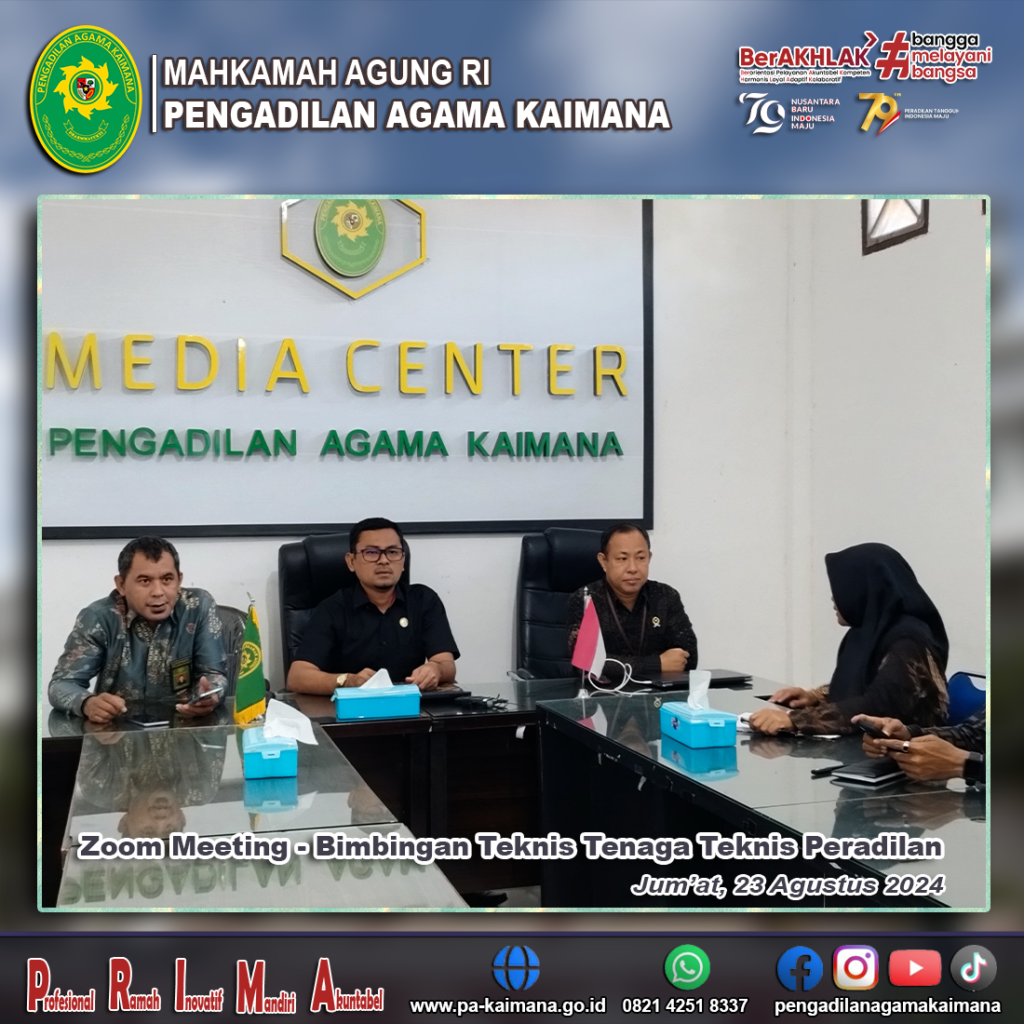 Jumat (23/08/2024), Bertempat di Ruang Media Center PA Kaimana telah berlangsung Zoom Meeting – Bimbingan Teknis dan Peningkatan Kompetensi Tenaga Teknis di Lingkungan Peradilan Agama yang juga disiarkan langsung melalui Badilag TV dengan Tema “Hukum Wakaf dalam Putusan Pengadilan”. Dalam kesempatan itu bertindak selaku narasumber yakni YM. Hakim Agung Kamar Agama Mahkamah Agung RI, […]