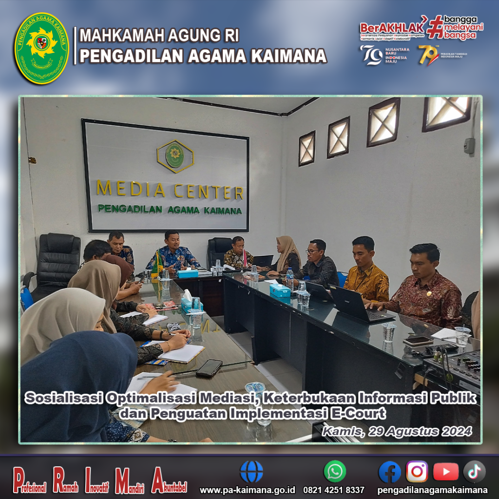 Kamis (29/8/24), Bertempat di Ruang Media Center Pengadilan Agama Kaimana telah berlangsung Rapat Sosialisasi Optimalisasi Mediasi, Keterbukaan Informasi Publik dan Penguatan Implementasi E-Court. Ketua Pengadilan Agama Kaimana, Saiin Ngalim selaku pimpinan rapat dan diikuti oleh Wakil Ketua, Hakim, Seluruh Pegawai, PPNPN maupun Tenaga Honorer Pengadilan Agama Kaimana. Materi pertama dengan judul “Sosialisasi Optimalisasi Mediasi di […]