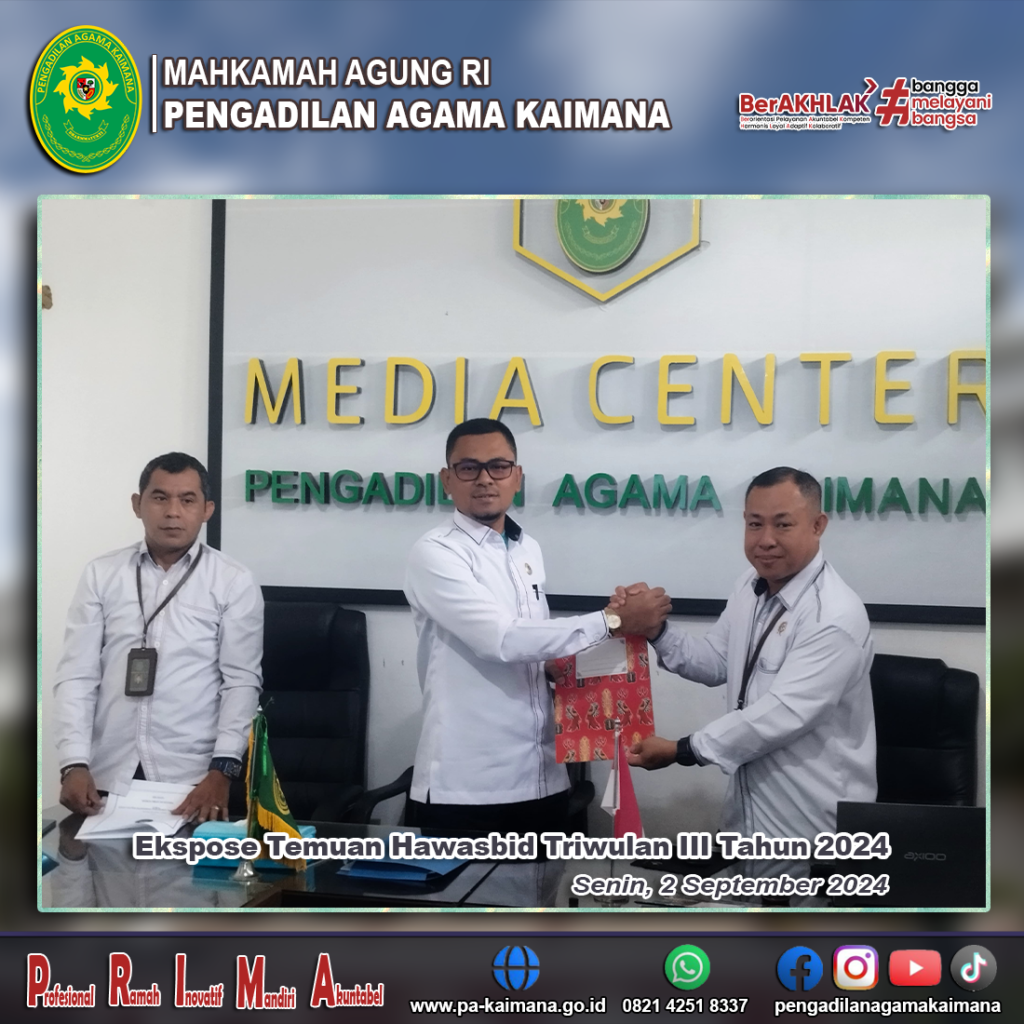 Senin (02/09/24), bertempat di Ruang Media Center Pengadilan Agama Kaimana dilaksanakan kegiatan Rapat Ekspos Hasil Pengawasan Hawasbid Triwulan III. Acara dibuka oleh Sekretaris Rustam Lengkas, S.H.I. sedangkan acara dipimpin oleh Ketua Pengadilan Agama, Saiin Ngalim, S.H.I., M.M. diikuti oleh Wakil Ketua, Hakim, Seluruh Pegawai, PPNPN maupun Tenaga Honorer Pengadilan Agama Kaimana. Dalam rapat tersebut […]