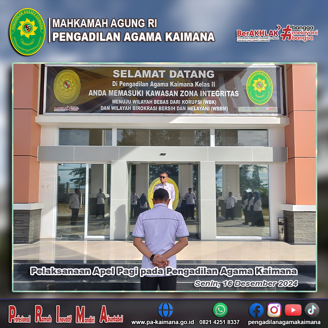 Senin (16/12/2024), Pengadilan Agama Kaimana kembali melaksanakan Apel Pagi, Saiin Ngalim, S.H.I., M.H. selaku pembina apel diikuti oleh seluruh Pegawai, PPNPN, dan Honorer Pengadilan Agama Kaimana.