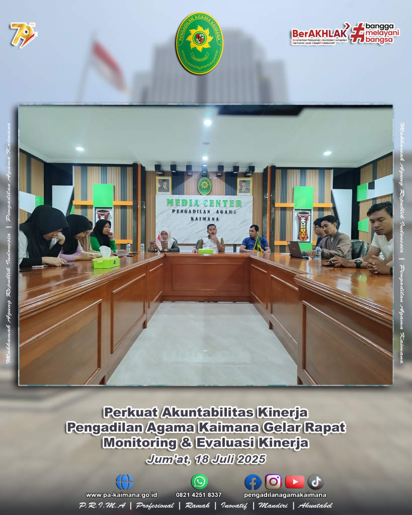 Kaimana – Pengadilan Agama Kaimana menggelar rapat monitoring and evaluation (monev) Standar Operasional Prosedur (SOP) layanan pada Kamis, 24 Juli 2025 bertempat di Ruang Media Center. Rapat yang berlangsung dari pukul 09.00 hingga 11.00 WIT ini diikuti oleh seluruh aparatur, mulai dari Ketua, para hakim, pejabat kepaniteraan, hingga jajaran kesekretariatan. Kegiatan ini […]