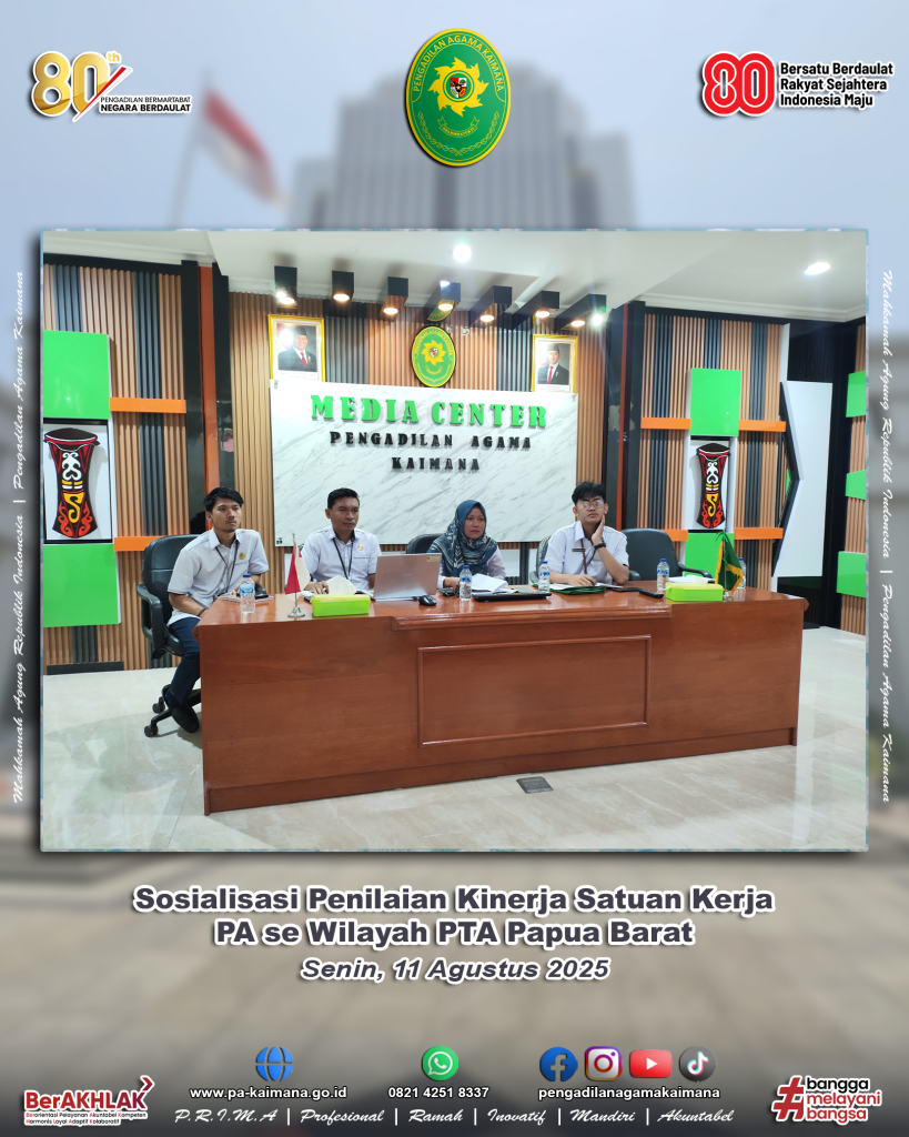 Kaimana, 11 Agustus 2025 – Bertempat di Ruang Media Center, Pengadilan Agama Kaimana mengikuti Sosialisasi Penilaian Kinerja Satuan Kerja Pengadilan Agama Sewilayah Hukum Pengadilan Tinggi Agama Papua Barat yang dilaksanakan secara daring melalui platform Zoom. Kegiatan ini diselenggarakan oleh PTA Papua Barat sebagai bentuk komitmen dalam melakukan monitoring dan evaluasi penilaian kinerja […]