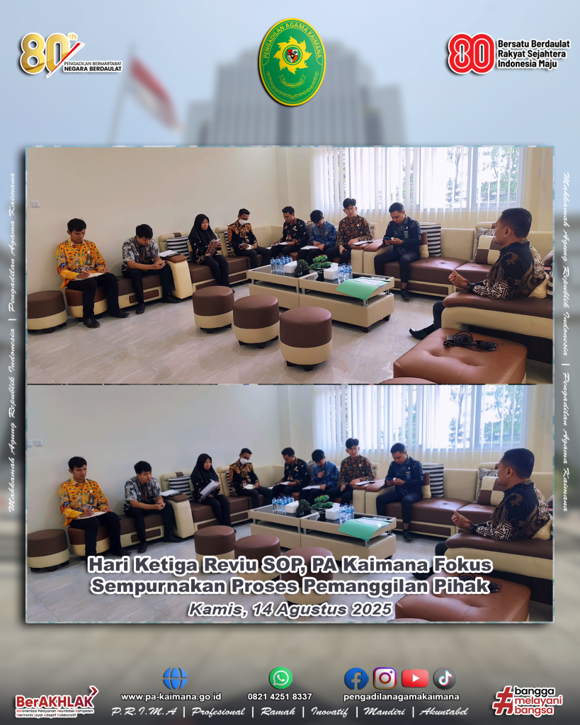 Kaimana – Pengadilan Agama Kaimana menggelar rapat ke-3 review Standar Operational Prosedur (SOP) pada Kamis, 14 Agustus 2025 di Ruang Ketua Pengadilan Agama Kaimana. Rapat yang dimulai pukul 09.30 WIT hingga selesai ini menjadi kelanjutan dari dua pertemuan sebelumnya yang berfokus pada pembaruan dan perbaikan prosedur kerja pemanggilan para pihak berperkara. […]