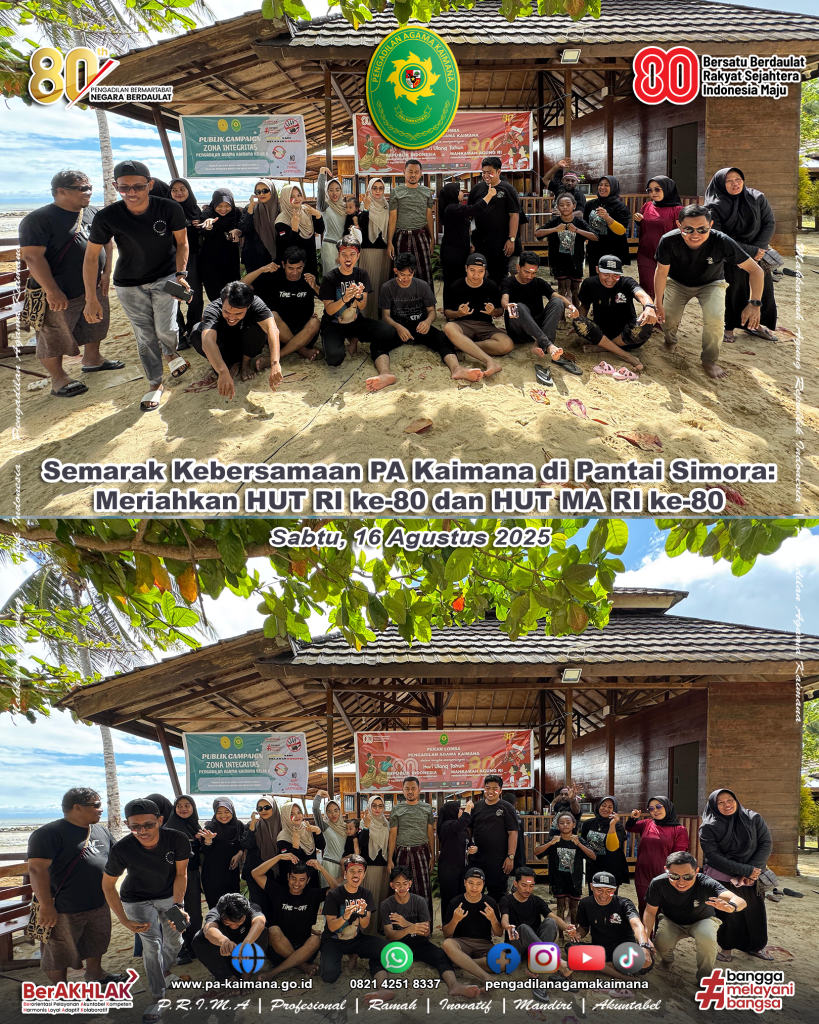 Kaimana, 16 Agustus 2025 – Pantai Simora, Kaimana, hari ini dipenuhi riuh tawa dan semangat kebersamaan keluarga besar Pengadilan Agama Kaimana. Dalam rangka memperingati Hari Ulang Tahun Kemerdekaan RI ke-80 dan Hari Ulang Tahun Mahkamah Agung RI ke-80, berbagai lomba seru digelar sejak pagi hingga sore. Momentum ini tidak hanya menjadi perayaan, […]