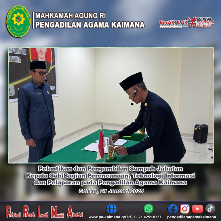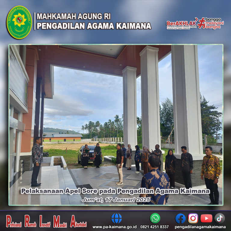 Selamat datang di Website Pengadilan Agama Kaimana. Website ini dibuat sebagai sarana untuk memberikan beragam informasi khususnya yang berkaitan dengan tugas pokok dan fungsi Pengadilan Agama Kaimana.